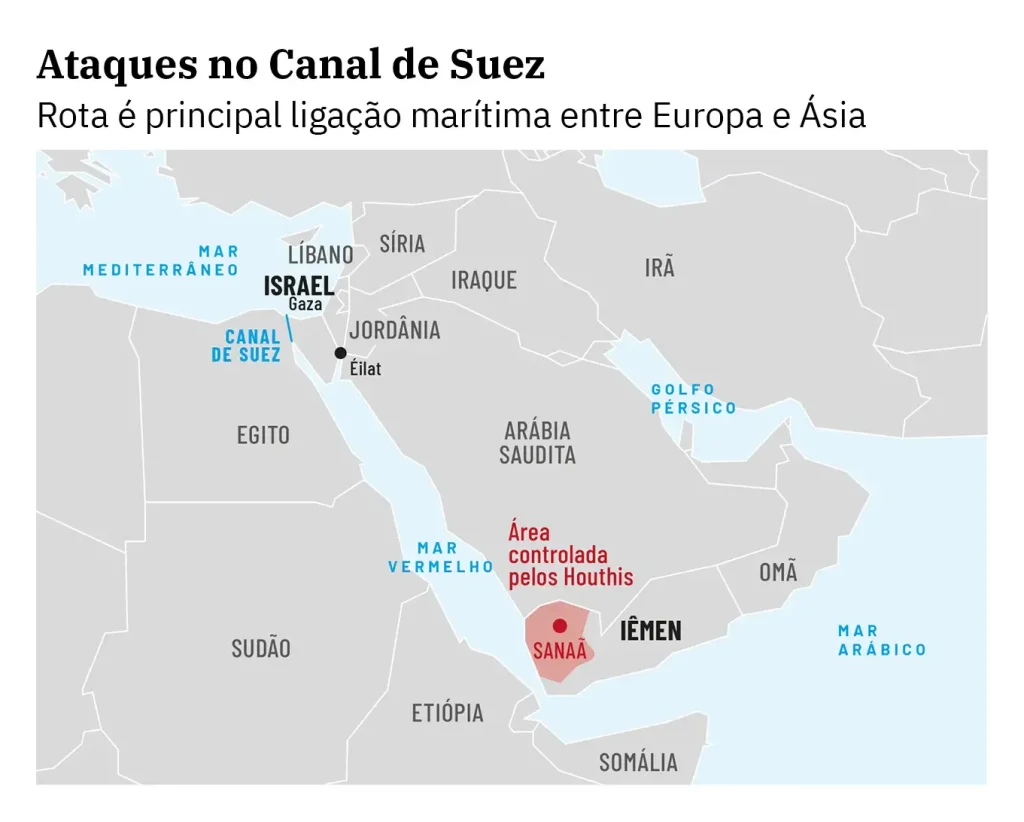Essa rota, que atravessa o Egito, é responsável por cerca de 15% do comércio global e 30% do transporte de contêineres, de acordo com o Fundo Monetário Internacional (FMI). Contudo, os ataques dos houthis causaram uma queda acentuada no tráfego.